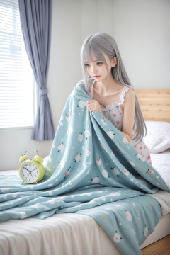 masterpiece,best quality,illustration,ultra detailed,hdr,Depth of field,(colorful),loli,1girl,clock,solo,alarm clock,under covers,green eyes,bed,long hair,pillow,indoors,sunlight,curtains,pajamas,grey hair,blanket,window,collarbone,bangs,