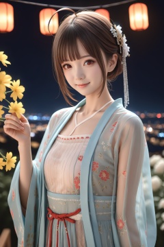 (masterpiece),(best quality),illustration,ultra detailed,hdr,Depth of field,(colorful),night,1girl,solo,red eyes,looking at viewer,hair ornament,short hair,upper body,brown hair,blurry,ahoge,bangs,see-through,depth of field,hanfu,smile,floral print,closed mouth,