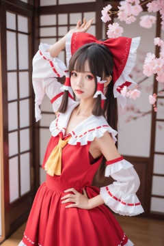 masterpiece,Realism,best quality,loli,1girl,hakurei reimu,bow,solo,hair bow,hair tubes,red bow,ascot,red skirt,detached sleeves,frills,hand on own hip,skirt,long hair,realistic,wide sleeves,brown hair,yellow ascot,blurry,frilled bow,frilled shirt collar,ribbon-trimmed sleeves,red lips,cherry blossoms,ribbon trim,shirt,lips,sidelocks,skirt set,parted lips,looking at viewer,makeup,sliding doors,red shirt,depth of field,hand up,indoors,red vest,brown eyes,sleeveless shirt,lipstick,blurry foreground,arm up,ponytail,flower,black hair,sleeveless,black eyes,dutch angle,long sleeves,ribbon,parody,cowboy shot,vest,