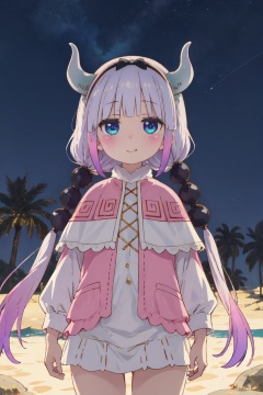<lora:Kanna-000015:0.9>,kanna cyql,1girl,looking at viewer,solo,dragon girl,long hair,purple hair,blunt bangs,twintails,low twintails,dragon horns,hairband,hair ornament,hair beads,multicolored hair,blue eyes,capelet,dress,black hairband,child,bow,long sleeves,evil smile,bust,Amidst the boundless expanse of sand, a verdant oasis stands like a mirage, where clear pools are shaded by date palms,(Enchanted trees, Fireflies, Glowworms, Magic atmosphere, Twilight hues, Whispers of the forest:0.5),beautiful detailed sky,beautiful detailed glow,posing in front of a colorful and dynamic background,masterpiece,best quality,beautiful and aesthetic,contrapposto,female focus,wallpaper,