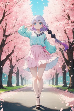 <lora:Kanna-000015:0.9>,kanna cyql,1girl,looking at viewer,solo,long hair,purple hair,blunt bangs,twintails,low twintails,multicolored hair,blue eyes,child,Frilled white shirt tucked into a high-waisted pleated maxi skirt with strappy heels,drunk,full_shot,With the spring breeze, cherry blossom petals flutter beneath the trees in a confetti of pink and white, dancing lightly with the wind. A subtle fragrance fills the air,(Bamboo shoots, Bamboo canopy, Misty atmosphere, Rustling leaves, Zen tranquility, Bamboo grove:0.5),beautiful detailed sky,beautiful detailed glow,posing in front of a colorful and dynamic background,masterpiece,best quality,beautiful and aesthetic,contrapposto,female focus,wallpaper,