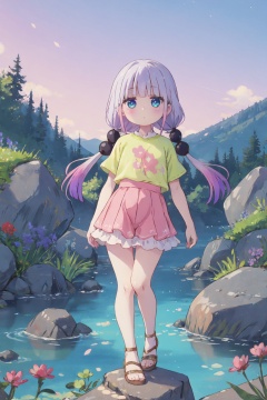 <lora:Kanna:0.9>,kanna cyql,1girl,looking at viewer,solo,long hair,purple hair,blunt bangs,twintails,low twintails,multicolored hair,blue eyes,child,Cropped frilled shirt matched with a tiered ruffle long skirt and flat sandals,light_blush,upper_body,Trickling through the mountains, the clear stream allows a view of its pebbled bed, surrounded by clusters of wildflowers along its banks and moss-covered rocks. Occasionally,(Grapevines, Harvested grapes, Vineyard rows, Wooden barrels, Harvest festival, Golden hour:0.5),beautiful detailed sky,beautiful detailed glow,posing in front of a colorful and dynamic background,masterpiece,best quality,beautiful and aesthetic,contrapposto,female focus,wallpaper,