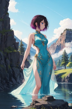 <lora:Elma-000013:0.8>,Elma CYQL,1girl,looking at viewer,solo,short hair,black hair,purple hair,multicolored hair,gradient hair,blue eyes,One-shoulder evening gown,smile,profile,Nested within the silent embrace of a volcano, a jade-green lake rests, encircled by steep cliffs shrouded in mist. It resembles a mystical eye of the earth,(Wildflowers, Butterflies, Bees, Tall grass, Bright sunshine, Blue sky:0.5),beautiful detailed sky,beautiful detailed glow,posing in front of a colorful and dynamic background,masterpiece,best quality,beautiful and aesthetic,contrapposto,female focus,wallpaper,
