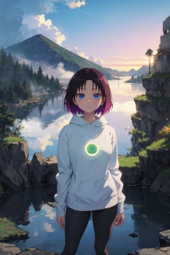 <lora:Elma-000013:0.8>,Elma CYQL,1girl,looking at viewer,solo,short hair,black hair,purple hair,multicolored hair,gradient hair,blue eyes,Aran sweater hoodie with leggings and chunky lace-up boots,naughty_face,cowboy_shot,Nested within the silent embrace of a volcano, a jade-green lake rests, encircled by steep cliffs shrouded in mist. It resembles a mystical eye of the earth,(Epiphytes, Rainforest canopy, Canopy walk, Exotic birds, Tropical humidity, Rainforest adventure:0.5),beautiful detailed sky,beautiful detailed glow,posing in front of a colorful and dynamic background,masterpiece,best quality,beautiful and aesthetic,contrapposto,female focus,wallpaper,