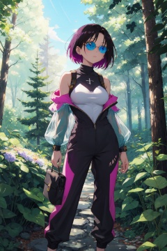 <lora:Elma-000013:0.8>,Elma CYQL,1girl,looking at viewer,solo,short hair,black hair,purple hair,multicolored hair,gradient hair,blue eyes,Cropped jumpsuit, wedge sandals, shoulder bag, cuff bracelet, sunglasses,giggling,cowboy_shot,Dense trees intertwine to form a dark green canopy, where sunlight struggles to penetrate. Winding forest paths lead through, and occasional beams illuminate mushrooms and ferns,(Rose bushes, Trellises, Garden path, Rose fragrance, English elegance, Rose petals:0.5),beautiful detailed sky,beautiful detailed glow,posing in front of a colorful and dynamic background,masterpiece,best quality,beautiful and aesthetic,contrapposto,female focus,wallpaper,