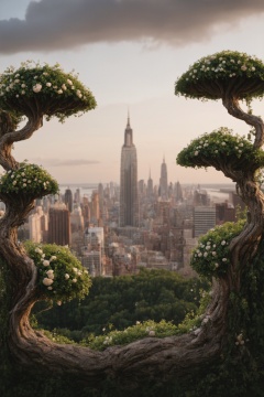Floating Cityscape: A majestic, whimsical metropolis suspended amidst a dreamy, enchanted forest. Vibrant green foliage and sparkling flowers dance beneath the clouds, as twisted trees and vines stretch towards the sky. Natural lighting casts dramatic shadows, while unique fantastical elements like floating islands and orbs add depth. Highly detailed vegetation and intricate mushroom textures shine with luscious color and rim light. A stunning, cinematic masterpiece featuring a beautifully lit cityscape at golden hour, with a blurred background and selective focus, evoking hope and wonder in the viewer.