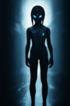 A lone figure, a girl with an otherworldly aura, stands tall in a blurry, indistinct environment. Her upper body is the focal point, illuminated by an ethereal glow emanating from her eyes, which radiate an intense, pulsing light. The blurred background adds to the sense of mystery and isolation, as she embodies the essence of science fiction's most enigmatic alien species.