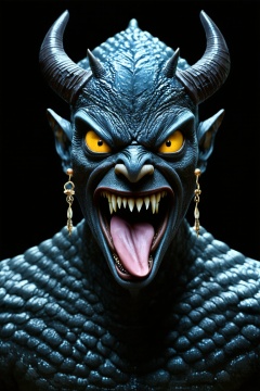 solo, looking at viewer, open mouth, simple background, jewelry, yellow eyes, earrings, horns, teeth, tongue, no humans, sharp teeth, black background, colored sclera, monster, scales