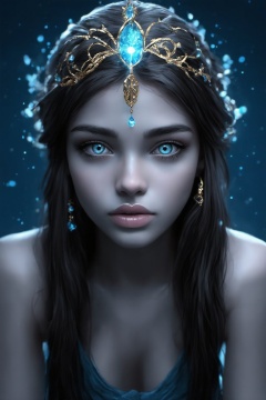 A mesmerizing portrait of a single girl with striking features. She sits proudly, her long, dark locks cascading down her back like a waterfall of night. Her piercing blue eyes lock onto the viewer's gaze, as if sharing a secret. A delicate hair ornament adorns her crown, drawing attention to her radiant lips and pert nose. Her glowing complexion is a warm, golden brown, accented by a subtle blue undertone that complements her mystical aura. The overall mood is one of ethereal serenity, set against a serene blue background that seems to emanate from the very essence of her being.