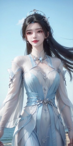 , Blue sky and white clouds on the beach,Masterpiece, (ultra wide angle lens: 1.2), Unity8k wallpaper, best quality, (detail shadow: 1.1), a beautiful girl, on a sea of light blue silk, translucent silk, floating light blue silk, surrealist style, minimalism, highly detailed texture, light blue, white clean background, CG rendering, light passing through clouds, 8k resolution, (motion photo: 1.2), (Fidelity: 1.4), original photos, movie lighting, 1girl,, ,, , weddingdress,limuwan