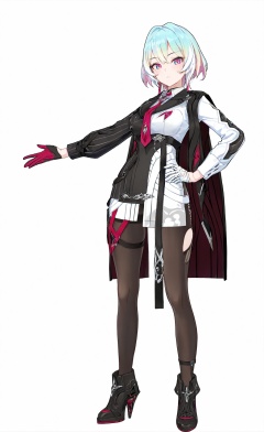 score_9, score_8_up, score_7_up, score_6_up, 8k, 8k, best quality, masterpiece, (ultra-detailed), (high detailed skin), white background, simple background, (full body), (white background:1.2), standing, looking at viewer, (solo), hand on hip, <lora:Lantern-kohaku-Tanger:0.8>, dengsfl,def clothes,multicolored hair,1girl,multicolored eyes, necktie,gloves,pantyhose,black footwear,