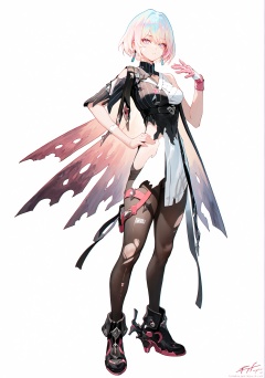score_9, score_8_up, score_7_up, score_6_up, 8k, 8k, best quality, masterpiece, (ultra-detailed:1.1), (high detailed skin), (full body), ( white background:1.3), standing, looking at viewer, (solo), hand on hip, <lora:Lantern-pony-Tanger:0.8>, dengsfl, broken clothes, torn clothes, multicolored hair, 1girl, multicolored eyes, bandages, bandaged arm, pantyhose, black footwear, pink gloves, single glove, torn pantyhose, short hair, (beautiful_face), ((intricate_detail)), clear face, ((finely_detailed)), fine_fabric_emphasis, ((glossy)), full_shot,