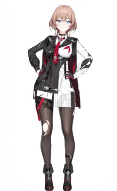 score_9, score_8_up, score_7_up, score_6_up, 8k, 8k, best quality, masterpiece, (ultra-detailed), (high detailed skin), white background, simple background, (full body), (white background), standing, looking at viewer, (solo), hand on hip, <lora:Lantern-A3-Tanger:0.8>, dengsfl, def clothes, brown hair, 1girl, blue eyes, red necktie,  gloves, pantyhose, black footwear,