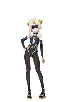 score_9, score_8_up, score_7_up, score_anime, 8k, best quality, masterpiece, (ultra-detailed), (white background,simple background:1.3), solo, hands on hip, (full body:1.1), looking at viewer, <lora:qianren-pony-Tanger:0.8>, qianren, qianren's def clothes, 1girl, blindfold, blonde hair, pantyhose, bodysuit, joints, black shoes,