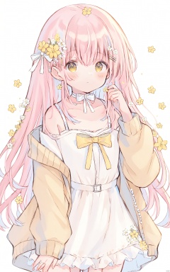 1girl, solo, dress, pink hair, white dress, long hair, hair flower, flower, hair ornament, looking at viewer, yellow eyes, bangs, closed mouth, blush, long sleeves, simple background, yellow flower, jacket, bow, off shoulder, open clothes, hair between eyes