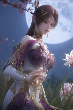 (Masterpiece:1.2), best quality,1girl, looking_at_viewer,(big breasts:1.29),Xyaoye,full moon,flowers