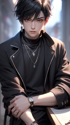 CG,jewelry,black hair,solo,necklace,looking at viewer,bracelet,earrings,short hair,blurry,blurry background,cup,male focus,upper body,brown eyes,jacket,1boy,shirt,lips,closed mouth,head rest,watch,black jacket,1girl,wristwatch,