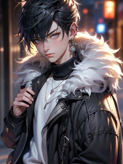 Best quality,masterpiece,8k,CG,1boy,jewelry,male focus,solo,black hair,blur background,earrings,mole under eye,fur trim,necklace,upper body,looking at viewer,piercing,short hair,coat,jacket,realistic,ear piercing,