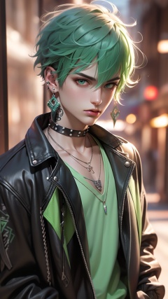 CG,solo, jewelry, jacket, green hair, earrings, necklace, male focus, looking at viewer, 1boy, piercing, upper body, short hair, shirt, black jacket, tattoo, ear piercing, leather, leather jacket, collar, chain, neck tattoo, closed mouth, open clothes, green shirt, bangs, open jacket, green eyes, chain necklace, choker, lips, eyelashes, messy hair, realistic, makeup, spikes