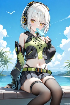 [ningen mame], 1girl,solo,(masterpiece:1.3),( beautiful:1.2),(high quality:1.2),(finely detailed:1.2),extremely detailed CG unity 8k wallpaper,best quality,a very delicate and beautiful,perfect fingers,(one cute girl at the center:1.2),1girl, solo, looking at viewer, short hair, bangs, skirt, thighhighs, gloves, long sleeves, navel, sitting, jacket, yellow eyes, white hair, pleated skirt, outdoors, detached sleeves, food, sky, day, black gloves, midriff, belt, artist name, black thighhighs, cloud, miniskirt, fingerless gloves, black skirt, blue sky, zettai ryouiki, crop top, thigh strap, headphones, bob cut, popsicle, food in mouth,anby