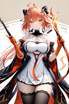 1girl, solo, long hair, breasts, looking at viewer, bangs, large breasts, hair ornament, thighhighs, gloves, dress, holding, cleavage, bare shoulders, yellow eyes, weapon, ahoge, red hair, black thighhighs, holding weapon, white dress, orange eyes, fire