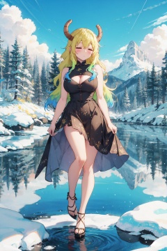 <lora:Quetzalcoatl-000019:0.8>,Lcoa CYQL,1girl,looking at viewer,solo,dragon girl,long hair,blonde hair,green hair,multicolored hair,gradient hair,dragon horns,closed eyes,breasts,large breasts,cleavage,full body,High-neck swing sundress with a geometric pattern,light_blush,portrait,Formed by melting glaciers, these lakes boast a unique azure hue, framed by surrounding snow-capped peaks. Their surfaces mirror calmness, reflecting blue skies and white clouds,(Orchids, Ferns, Palm trees, Epiphytes, Dense foliage, Humidity, Exotic birds:0.5),beautiful detailed sky,beautiful detailed glow,posing in front of a colorful and dynamic background,masterpiece,best quality,beautiful and aesthetic,contrapposto,female focus,wallpaper,