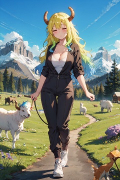 <lora:Quetzalcoatl-000019:0.8>,Lcoa CYQL,1girl,looking at viewer,solo,dragon girl,long hair,blonde hair,green hair,multicolored hair,gradient hair,dragon horns,closed eyes,breasts,large breasts,cleavage,full body,Loose jumpsuit, sneakers.,female_orgasm,upper_body,High above, a vast meadow stretches to the horizon, dotted with wildflowers. Cattle and sheep graze leisurely while snow-capped mountains encircle the scene in the distance,(Japanese irises, Iris pond, Stone lanterns, Water reflections, Summer blooms, Japanese elegance:0.5),beautiful detailed sky,beautiful detailed glow,posing in front of a colorful and dynamic background,masterpiece,best quality,beautiful and aesthetic,contrapposto,female focus,wallpaper,