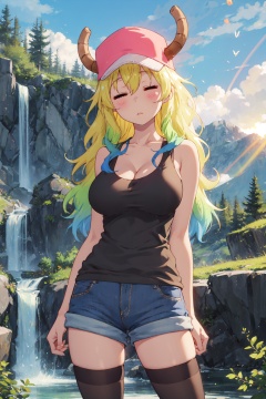 <lora:Quetzalcoatl-000019:0.8>,Lcoa CYQL,1girl,looking at viewer,solo,dragon girl,long hair,blonde hair,green hair,multicolored hair,gradient hair,horns through headwear,dragon horns,hat,pink headwear,closed eyes,**** top,black **** top,breasts,large breasts,cleavage,shorts,denim shorts,thighhighs,black thighhighs,denim,blue shorts,female_orgasm,bust,Within a mountain ravine, a waterfall plunges like a white silk ribbon, its roar deafening. Mist sprays everywhere, creating rainbows as sunlight pierces through the droplets, shimmering with a spectrum of colors,(Exotic plants, Botanical specimens, Glass conservatory, Evening glow, Tropical flora, Controlled environment:0.5),beautiful detailed sky,beautiful detailed glow,posing in front of a colorful and dynamic background,masterpiece,best quality,beautiful and aesthetic,contrapposto,female focus,wallpaper,