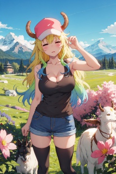 <lora:Quetzalcoatl-000019:0.8>,Lcoa CYQL,1girl,looking at viewer,solo,dragon girl,long hair,blonde hair,green hair,multicolored hair,gradient hair,horns through headwear,dragon horns,hat,pink headwear,closed eyes,**** top,black **** top,breasts,large breasts,cleavage,shorts,denim shorts,thighhighs,black thighhighs,denim,blue shorts,laughing,bust,High above, a vast meadow stretches to the horizon, dotted with wildflowers. Cattle and sheep graze leisurely while snow-capped mountains encircle the scene in the distance,(Wildflowers, Coastal cliffs, Pacific Ocean views, Coastal breeze, Wildflower bloom, California landscape:0.5),beautiful detailed sky,beautiful detailed glow,posing in front of a colorful and dynamic background,masterpiece,best quality,beautiful and aesthetic,contrapposto,female focus,wallpaper,