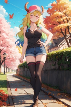 <lora:Quetzalcoatl-000019:0.8>,Lcoa CYQL,1girl,looking at viewer,solo,dragon girl,long hair,blonde hair,green hair,multicolored hair,gradient hair,horns through headwear,dragon horns,hat,pink headwear,closed eyes,**** top,black **** top,breasts,large breasts,cleavage,shorts,denim shorts,thighhighs,black thighhighs,denim,blue shorts,;d,portrait,In the golden season of autumn, maple leaves blaze like flames, covering the hillsides in hues of red and yellow. Fallen leaves pave paths of brilliance,(Cherry blossoms, Country lane, Blossom petals, Springtime charm, Rural tranquility, Cherry blossom drift:0.5),beautiful detailed sky,beautiful detailed glow,posing in front of a colorful and dynamic background,masterpiece,best quality,beautiful and aesthetic,contrapposto,female focus,wallpaper,