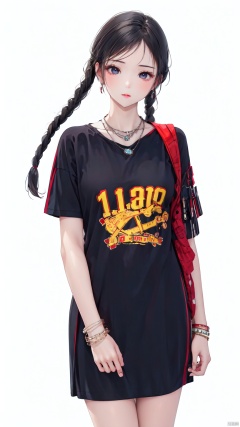 1girl, solo, long hair, black hair, white background, dress, , jewelry, necklace, twin braids, bracelet, clothes writing,,Look at the camera.<lora:EMS-431932-EMS:0.800000>, <lora:EMS-254762-EMS:0.400000>