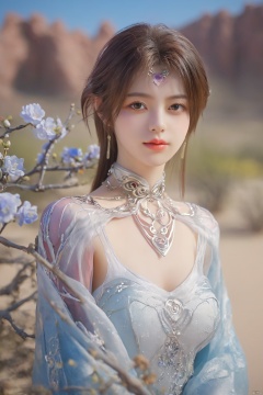 (Masterpiece:1.2), best quality,1girl, looking_at_viewer,(big breasts:1.39),Xyaoye,Large aperture, blurred background, spring scene,flowers, desert_sky