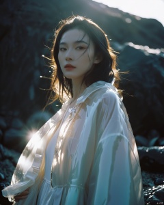 analog film photo chinese girl, cinematic film still, ((Establishing_Shot)), ((looking away)), expression of enjoyment, an ultra high definition professional high fashion portrait full length photograph, a model wearing a transparent pearlescent raincoat in an icelandic black rock environment at dawn, no artefacts, extremely detailed, stark, refraction, shallow depth of field, volumetric light and shadow, ray tracing, light rays, shallow depth of field, vignette, highly detailed, high budget, bokeh, cinemascope, moody, epic, gorgeous, film grain, grainy . faded film, desaturated, 35mm photo, grainy, vignette, vintage, Kodachrome, Lomography, stained, highly detailed, found footage, monkren, Fairy, realistic,sunlight