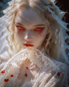 breathtaking vampire bride,film photography aesthetic,the delicate texture of lace veil gently obscuring her face,long blonde hair,looking at viewer,eye eye contact,sapphire red eyes,choker,devil smile,dynamic composition,skin texture,from above,sharp focus,horror \(theme\),dutch angle, . award-winning, professional, highly detailed