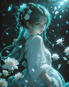 breathtaking face focus, masterpiece, best quality, 1girl, hatsune miku, white roses, petals, night background, fireflies, light particle, solo, aqua hair with twin tails, aqua eyes, standing, pixiv, depth of field, cinematic composition, best lighting, looking up . award-winning, professional, highly detailed