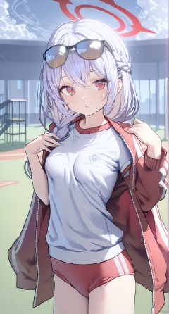 1girl,(masterpiece:1.3),( beautiful:1.2),(high quality:1.2),(finely detailed:1.2),extremely detailed CG unity 8k wallpaper,best quality,a very delicate and beautiful,perfect fingers,(one cute girl at the center:1.2), halo, red halo,loli,long hair, breasts, bangs, medium breasts, shirt, red eyes, hair between eyes, jacket, white shirt, braid, white hair, sweat, wings, low wings,open jacket, single braid, halo, eyewear on head, red jacket, gym uniform, track jacket, buruma, jacket on shoulders, gym shirt, red buruma, black wings, demon wings, low wings, looking_at_viewer, parted_lips, lawn, blue sky, clouds,playground, harunaBA,standing, cowboy_shot,hand_on_hips,
