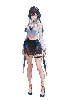 ASCII score_9, score_8_up, score_7_up, score_anime, 8k, best quality, masterpiece, (ultra-detailed), white background, full body, standing, looking at viewer, <lora:Katya-pony-Tanger:0.8>, Katya, 3rd clothes, mishu, 1girl, fishnets, skirt, breasts, black hair, multicolored hair, black skirt, long hair, high heels, black panties,