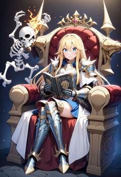 1girl, gauntlets, eyebrows visible through hat, looking at viewer, holographic interface, boots, shoulder armor, thigh boots, blonde hair, skirt, blue skirt, crossed legs, dark background, english text, hair between eyes, bone armor, blue eyes, white robe, armored boots, magic, closed mouth, casting spell, skeleton, book, knees together feet apart, plate armor, spiked armor, long hair, full body, black footwear, medieval, darkrai \(metal slug\), armor, smile, sitting, holding, breastplate, holding book, wide-eyed, solo, robe, throne, bone, helmet, masterpiece, best quality, absurdres, safe