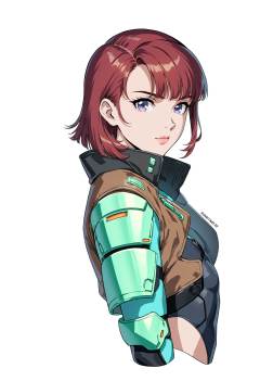 1girl, looking at viewer, drill hair, nose, sunglasses, twintails, cropped torso, retro artstyle, green gloves, gloves, solo, multicolored gloves, skin tight, simple background, leotard, samurai jacket \(cyberpunk\), artist name, high side ponytail, twin drills, black gloves, brown jacket, short hair, arms at sides, side ponytail, red hair, black armor, white background, scrunchie, hair ornament, high collar, long hair, jacket, blue eyes, small breasts, multicolored clothes, elbow gloves, lips, from side, breasts, 1990s \(style\), armor, closed mouth, upper body, purple eyes, arm armor, realistic, arm guards, science fiction, brown hair, faulds, masterpiece, best quality, absurdres, sensitive