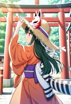 1girl, rope, shimenawa, fox mask, haniwa \(statue\), sidelighting, from side, closed mouth, purple sash, looking to the side, hand on headwear, hair ribbon, onigawara visible through hat, alternate eye color, torii, sash, white ribbon, red eyes, smile, sideways mouth, orange kimono, unworn mask, japanese clothes, alternate costume, tress ribbon, long hair, long sleeves, dark green hair, upper body, straw hat, mask, shrine, solo, hands up, ribbon, kimono, noh mask, hat, standing, masterpiece, best quality, absurdres, safe