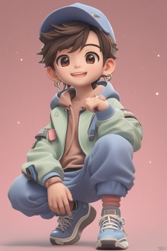 3Dstyle,solo, looking at viewer, smile, short hair, simple background, brown hair, black hair, long sleeves, 1boy, hat, brown eyes, jewelry, jacket, full body, male focus, earrings, shoes, shorts, pants, hood, gradient, gradient background, hoodie, squatting, pink background, hood down, blue jacket, sneakers, baseball cap, index finger raised, blue headwear, blue footwear, male child