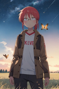 <lora:Kobayashi-000010:0.8>,kobayashi cyql,1girl,looking at viewer,solo,glasses,red hair,ponytail,brown eyes,sidelocks,Airline-specific outfit incorporating unique patterns and colors,yandere,upper_body,As darkness falls, the sky twinkles with countless stars, the Milky Way spanning across the heavens. A gentle breeze rustles through the grass, and the distant howl of wolves intermingles with the chirping of insects,(Bluebells, Misty forest, Ethereal atmosphere, Bluebell haze, Enchanted woodland, Morning mist:0.5),beautiful detailed sky,beautiful detailed glow,posing in front of a colorful and dynamic background,masterpiece,best quality,beautiful and aesthetic,contrapposto,female focus,wallpaper,