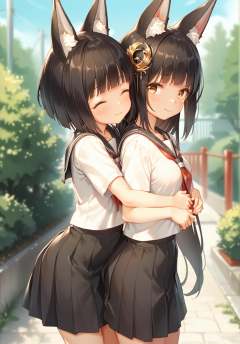 <lora:nagato&mutsu_pony_v0.2:0.8>,mutsu \(azur lane\), nagato \(azur lane\),2girls, short hair, long hair,fox ears,black hair,serafuku, school uniform,black skirt, (hug from behind), outdoors,grabbing hand from behind,, score_9, score_8_up, score_7_up, source_anime,