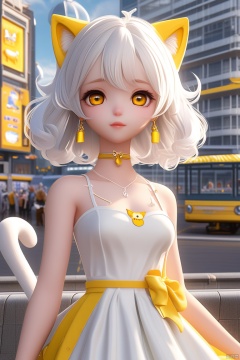 猫耳女孩,白色头发,白裙,黄色眼睛,3D style,铃铛,城市背景