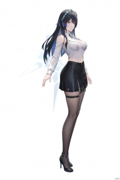 1girl, full body, best quality, high detail, , Katya, 3rd clothes, mishu, 1girl, pantyhose, skirt, breasts, black hair, multicolored hair, black skirt, long hair, high heels,