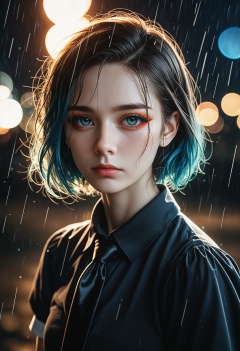 portrait,1girl,hskdmnd,crystal hair,colored eyelashes,multicolored hair,short hair,black shirt,puffy short sleeves,collared shirt,black necktie,white elbow gloves,looking at viewer,expressionless,dark background,rain,, cinematic film still,score_9,score_8_up,score_7_up,dramatic lighting,(realistic:1.3),highly detailed,high budget,bokeh,cinemascope,moody,epic,gorgeous,film grain,grainy,masterpiece,best quality,perfect anatomy,very aesthetic,official art,8k,