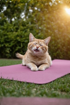 A serene and whimsical illustration of an anthropomorphic animal, possibly a cat or dog, engaging in a pilates exercise on a sunny morning, surrounded by lush greenery and warm golden light, with a soft focus effect to convey a sense of calmness and relaxation, the animal's fur a warm beige color with subtle shading, its facial features expressive and gentle, with a slight smile and closed eyes, wearing a soft pink yoga mat underneath, subtle sweat droplets on its fur to hint at the physical activity, the pilates equipment, such as a reformer or resistance bands, in muted earthy tones, blending seamlessly with the natural environment, with bold lines and playful textures to evoke a sense of joy and harmony, the overall mood tranquil and uplifting.,FuturEvoLabStyle