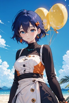 <lora:Belle-000018:0.8>,Belle CYQL,1girl,looking at viewer,solo,blue hair,short hair,hair between eyes,blue eyes,jewelry,hair ornament,hairclip,earrings,Wrap front midi dress with balloon sleeves,teasing_smile,upper_body,Amidst the endless expanse of sand dunes, a verdant oasis emerges as a miraculous haven, with trickling springs and swaying date palms,beautiful detailed sky,beautiful detailed glow,posing in front of a colorful and dynamic background,masterpiece,best quality,beautiful and aesthetic,contrapposto,female focus,wallpaper,