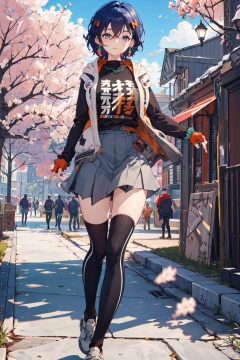 <lora:Belle-000018:0.8>,Belle CYQL,1girl,looking at viewer,solo,blue hair,short hair,hair between eyes,blue eyes,jewelry,hair ornament,hairclip,earrings,hood,jacket,shirt,black shirt,long sleeves,open clothes,open jacket,black jacket,multicolored clothes,fingerless gloves,wrist scrunchie,grey skirt,asymmetrical legwear,uneven legwear,single kneehigh,single sock,shoes,yandere,upper_body,With the spring breeze, cherry blossom petals flutter beneath the trees in a confetti of pink and white, dancing lightly with the wind. A subtle fragrance fills the air,beautiful detailed sky,beautiful detailed glow,posing in front of a colorful and dynamic background,masterpiece,best quality,beautiful and aesthetic,contrapposto,female focus,wallpaper,