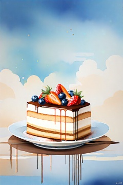 高品质,杰作,梦幻水彩,绘画艺术,精致的提拉米苏蛋糕,背景是蓝天,清新,多巴胺色,艺术感,和谐配色,极简主义风格,空间感,海报